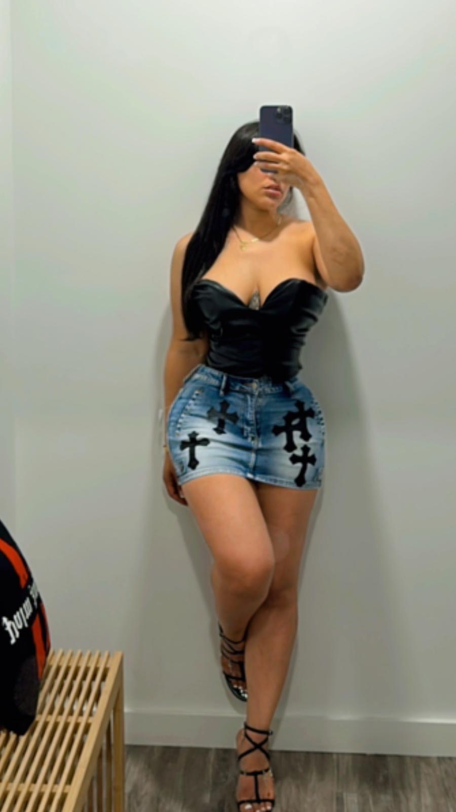 Vogue WOMEN’S WASHED DENIM MINI SKIRT WITH LEATHER CROSS PATCH